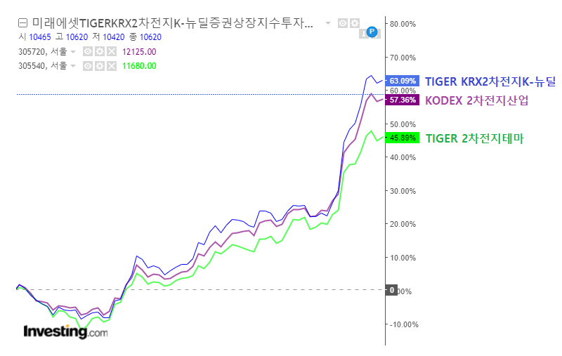 타이거 KRX2차전지K-뉴딜의 상장일인 2020년 10월 07일 부터 주가그래프를 보면 TIGER KRX2차전지K-뉴딜이 상장일부터 약 63% 상승, 코덱스 2차전지산업이 약 57% 상승, 타이거 2차전지테머가 약 45% 상승 했습니다.