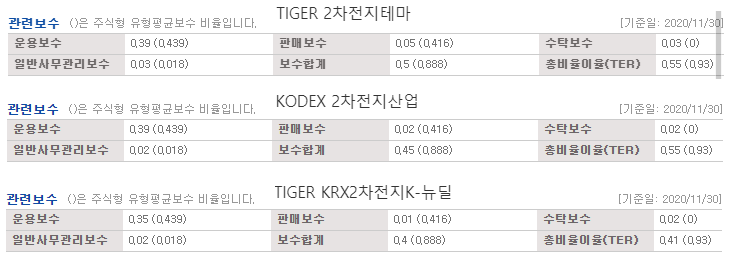 TIGER KRX2차전지K-뉴딜은 기본적으로 낮은 운용보수(펀드보수)로 시작 하기 때문에 기타보수가 나머지 두 상품 만큼만 산정 되어도 일단 보수면에선 아주 조금 유리하게 시작할 수 있습니다.