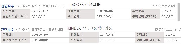 보수는 KODEX(코덱스) 삼성그룹이 조금더 높지만, 그렇게 큰 차이는 아닙니다.