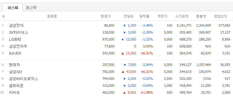 특히 삼성전자의 시가총액은 하위 기업 몇개를 합해도 따라 잡을 수 없을 정도입니다.