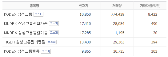 이중 거래량이 제일 잘나오는 ETF는 KODEX(코덱스) 삼성그룹 ETF 입니다.
