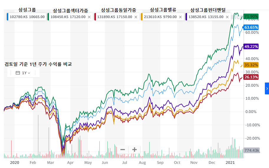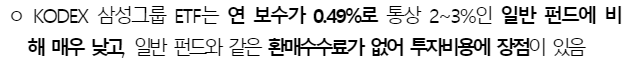그룹자체가 다양한 산업을 영위하고 있기 때문에 삼성그룹 ETF 하나만 사도 산업전반에 걸쳐 분산투자를 어느정도 하는 효과가 있는 상품입니다.