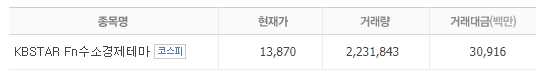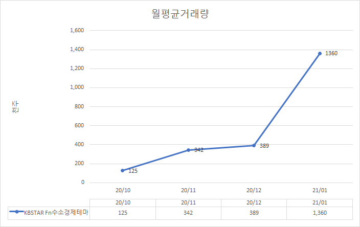 해당 지수를 추종하는 ETF는 검토일 기준 KBSTAR Fn수소경제테마가 유일하며, 꽤 좋은 수익률을 보이고 있으며, 거래량, 시총모두 괜찮은 편입니다.