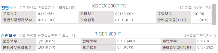 그렇더라도 기본 보수만 KODEX(코덱스) 200IT TR 와 TIGER(타이거) 200 IT가 약 2.5배 정도 차이가 납니다.