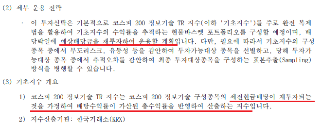 쉽게 받아야할 배당금 까지 지수의 수익률로 반영하기 때문에 장기투자시 배당 및 지수사승에 따른 복리효과가 있다고 운용사는 설명하고 있습니다.