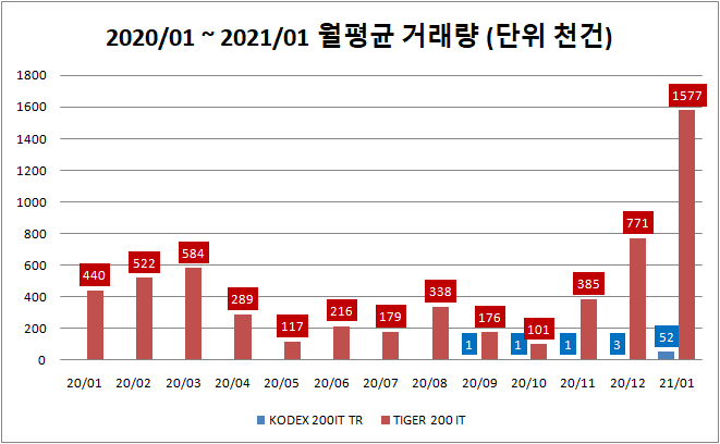 KODEX(코덱스) 200IT TR은 상장 후 월평균 약 1천건의 거래량을 보이고 21/01 들어서 약 5.2만건 거래량을 보이고 있습니다.