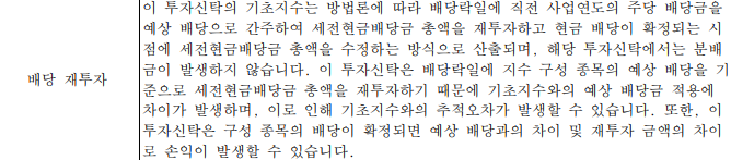 분배금 지급기준일 | 1, 4, 7, 10월 마지막 영업일 및 회계기간 종료일 | |