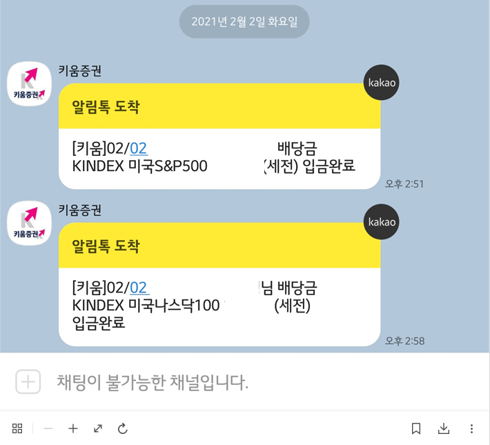 21/02/02 수익분배금입금으로 KINDEX(킨덱스) 미국S&P500 과 KINDEX(킨덱스) 미국나스닥 100 분배금 입금을 확인할 수 있습니다.