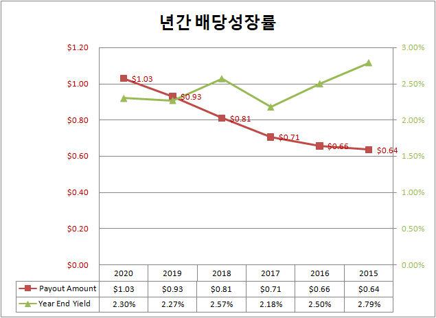 하지만, 고배당 ETF들에 비해 좋은 주가 수익률을 보이며, 상장일 이후 지금까지 해마다 약 10% 정도의 배당 성장을 보였습니다.