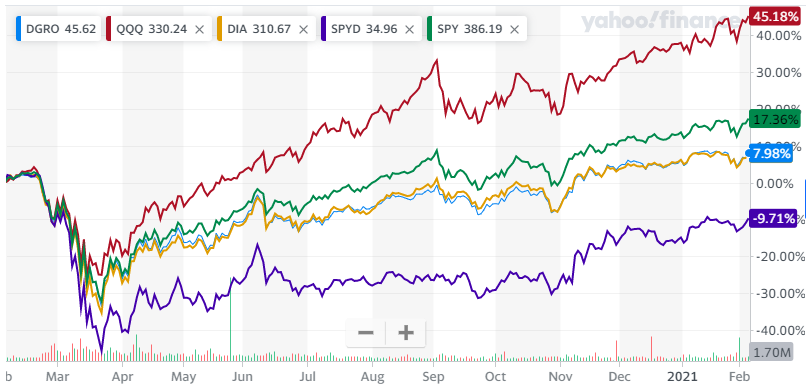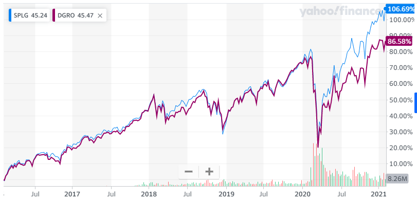 DGRO는 코로나 이후 DIA 같은 주가 수익률을 보이고 있습니다.