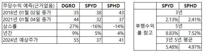 SPYD와 SPHD는 3년, 5년 후행수익률의 평균으로 주가를 계산 하여 년간 약 5%, 4%의 주가 성장으로 계산했습니다.
