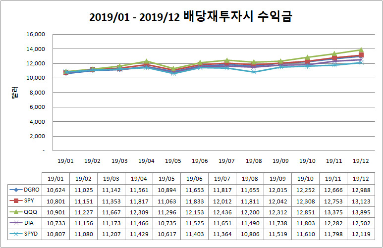 2019년 01월 부터 2019년 12월 까지 배당 재투자시 수익률 입니다.