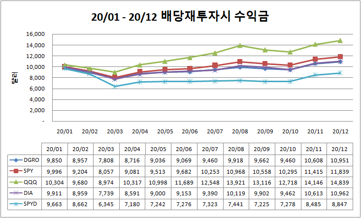2020년 01월 부터 2020년 12월 까지 배당 재투자시의 수익률 입니다.