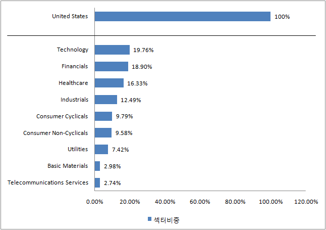 국가비중은 미국 100%이며, 산업섹터는 기술섹터가 가장 높고 2위 금융, 3위 헬스케어 순입니다.