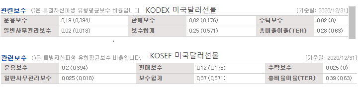 KODEX(코덱스) 미국달러 선물의 보수합계(펀드보수)는 0.25이며 총비율이율 TER은 0.28로 KOSEF(키움) 미국달러선물보다 약 0.11정도 낮습니다.