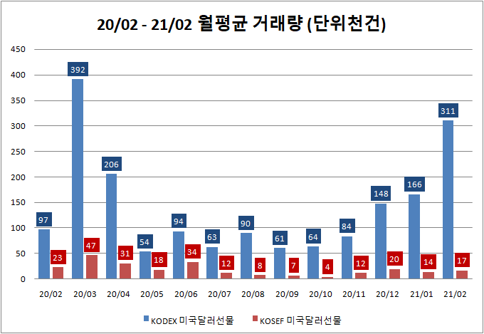 월평균 거래량으로 KODEX(코덱스) 미국달러선물의 거래량이 2020년 12월 부터 증가하고 있습니다.