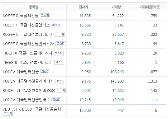 미국달러선물로 상품 검색시 인버스, 레버리지 제외, 거래량이 일거래량 1만건 미만 제외시 KOSEF와 KODEX 두가지 상품으로 압축되었습니다.