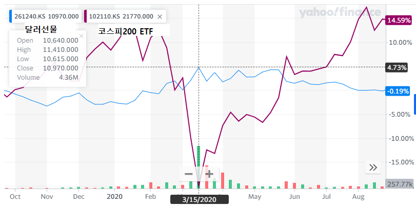 코로나 하락장에서의 달러와 TIGER TOP 10 ETF와 TIGER 200 ETF의 주가 비교 그래프 입니다.