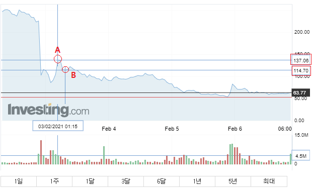 - A 지점 53달러 - E 지점 82달러 = 주당 약 29달러 손해 입니다. 주식을 빌려준 투자자에게 수수료도 줘야하니 주당 29달러가 넘는 손해를 기록합니다.