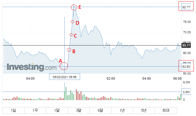 ■ A지점 53달러에 매도를 시작해서 공매도 기간 E지점 82달러까지 와버리고 공매도 자들은 주식을 상환해야 하기 때문에 E 지점인 약 82달러에 주식을 사서 반환합니다.