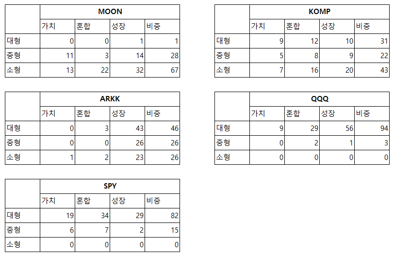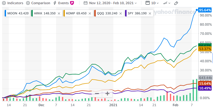 MOON이 상장이후 약 95% 수익을 보이고 있으며, 같은 기간동안 ARKK와 KOMP는 거의 비슷한 수익률을 보이고 있습니다.