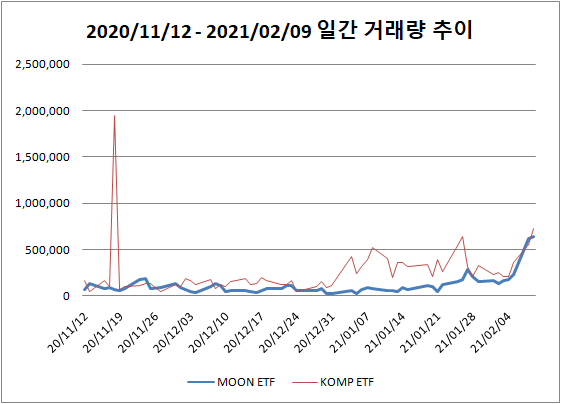 MOON ETF의 거래량은 최근 증가하는 추세입니다. 운용비용은 0.65로 KOMP 보다 높은 편이지만 ARK의 ETF 보단 0.1 정도 낮습니다.