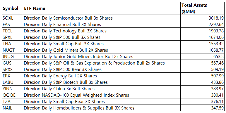 운용사인 Direxion(디렉션)은 미국 전체 운용사중 상위 20% 안에 들어가는 운용규모를 가지고 있긴 하지만 대부분 운용중인 상품이 레버리지와 인버스 상품입니다.