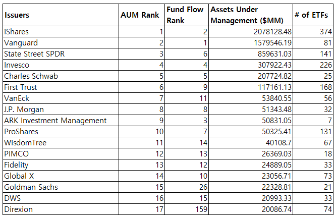 하지만, 3개월 자금 흐름을 기준으로 순위가 결정되는 Fund Flow Rank로는 약 159위에 위치한 운용사 입니다. 운용규모에 비해 그다지 인기가 있는 ETF를 가진 운용사는 아닙니다.