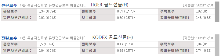 운용보수(펀스보수)로만 봤을때 TIGER(타이거) 골드선물(H)가 0.29정도 KODEX(코덱스) 골드선물(H)보다 운용비용이 낮습니다.