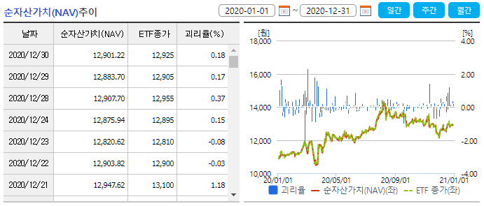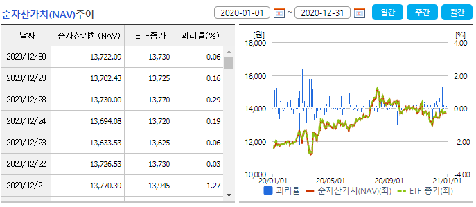 TIGER(타이거) 골드선물(H)의 2020년 01월 01일 ~ 2020년 12월 31일 까지의 일간 괴리율 입니다.
