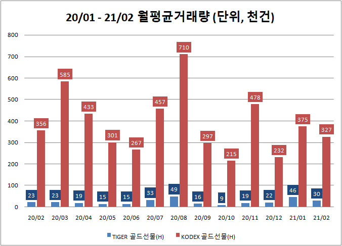 검토일 기준 TIGER(타이거) 골드선물(H) 상품의 시가총액, 거래량 모두 KODEX(코덱스) 골드선물(H) 보다 낮습니다.