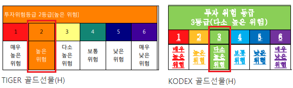 TIGER(타이거) 골드선물(H), KODEX(코덱스) 골드선물(H) 두 상품모두 투자 위험등급은 높은 편입니다.