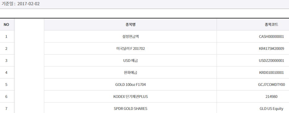 KODEX(코덱스) 골드선물(H)의 구성종목입니다. 2017년엔 단기채권도 구성종목에 포함되어 있으며, 미국달러 F 선물도 투자를 합니다.