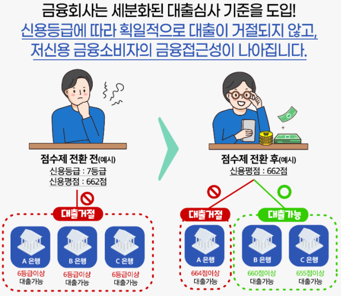 ▷ 신용점수제도로 인해 금융회사의 세분화된 대출심사 기준을 도입해 신용등급에 따라 획일적으로 대출이 거절되지 않고, 저신용 금융소비자의 금융접근성이 나아지고 개선된다고 알리고 있습니다.