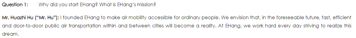 Mr. Hu: Many investors believe in EHang’s mission and technological advancements, while others may have doubts. This is normal, and we need to do a better job to help more investors understand our business. Short-selling reports are tools used by certain profit seekers on the capital market – I get that. But this short-seller did not attempt to understand EHang’s technologies and business model. Its report was based on shoddy research and contains numerous errors, unsubstantiated statements, and misinterpretation of information. In addition to the issues I have directly addressed earlier, we have the following responses to some other false allegations made by this short-seller: