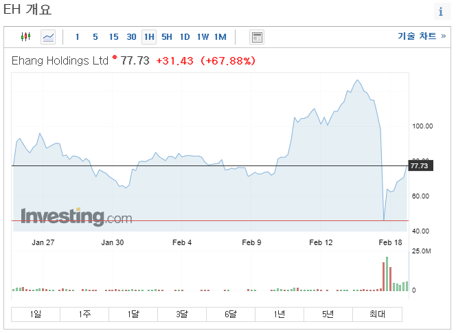 ■ 이항(EHANG, EH)는 2021년 02월 17일(미국 동부시간) 약 67% 상승했습니다.