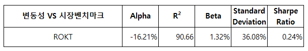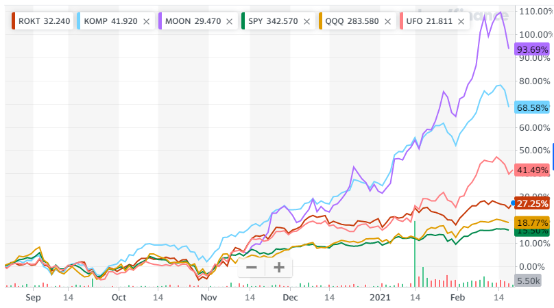 최근 6개월 주가 그래프 입니다. ROKT는 SPY나 QQQ보다 수익률이 좋았지만, UFO, KOMP, MOON 보단 수익률이 떨어졌습니다.