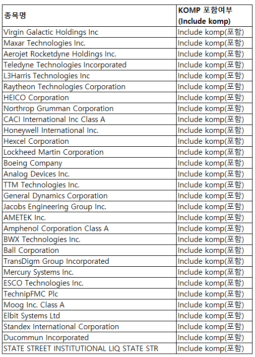비중 1~10위 모두 미국 기업이며, 버진 캘럭틱은 2020년 6월, 맥사 테크놀로지는 2019년 12월에 편입되었습니다.