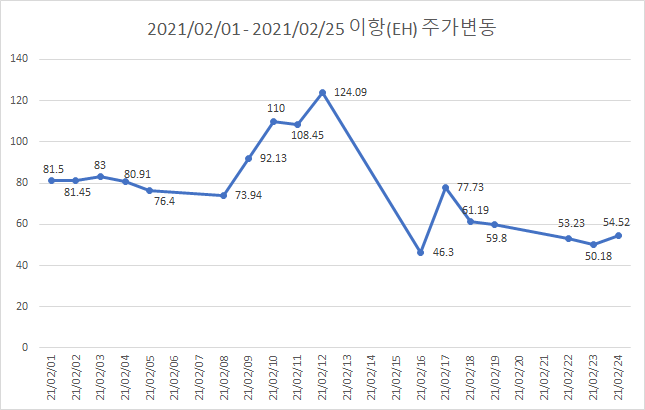 2021년 2월 16일, 이항(EHANG, EH)의 하락 ■ 이항(EHANG, EH)의 주가가 약 62% 가까이 하락했습니다. ▷ 이항(EHANG, EH)은 상업용, 탑승용 드론 쪽 라이선스를 받았다는 내용과 최근 자율 주행 택시 등으로