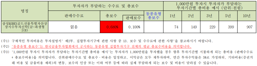 코덱스 골드선물의 투자설명서를 보면 수수료 및 총보수가 0.68%로 설정되어 있고 1,000만 원 투자 시 지불되는 비용은 약 74천 원입니다. 이를 봤을 때, 기타 비용을 포함한 보수라는 걸 알 수 있습니다.