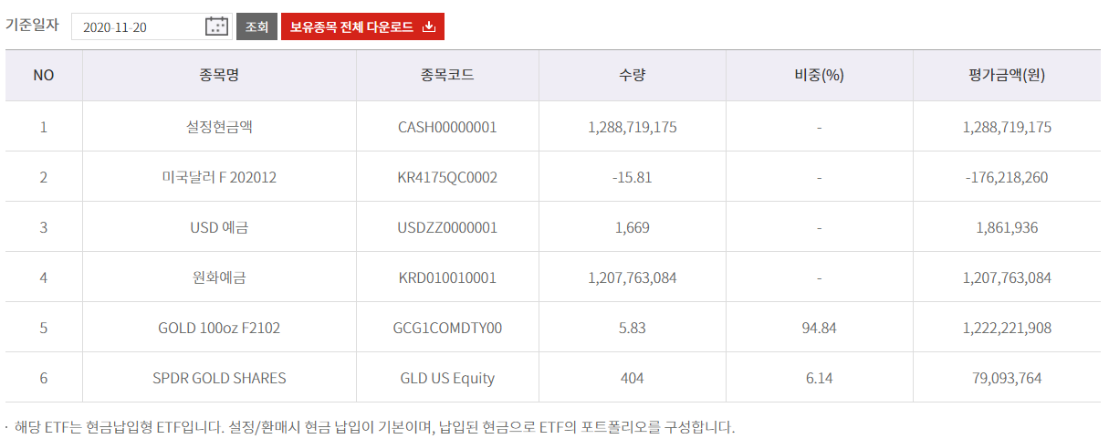 GLD ETF 가 약 6%, GOLD 100oz F2102 선물이 약 94%로 구성되어 있습니다.