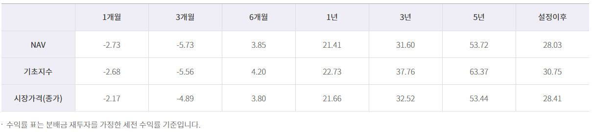 괴리율도 해외지수 추종인 경우 ±2% 초과시 공시를 하도록 되어 있으며, 그 기준안에서 괜찮은 괴리율을 보여주고 있습니다.