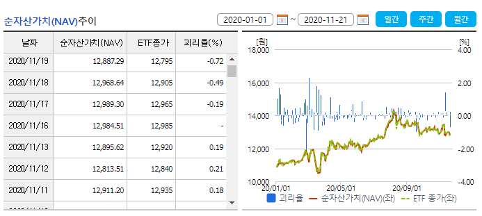 ±2% 초과 시 괴리율 대한 공시를 하도록 되어 있으며, 2020년 01월 부터 ±2% 초과한 손에 꼽을 정도입니다.