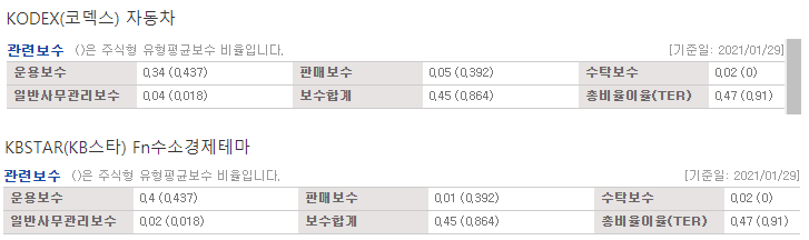 KODEX(코덱스) 자동차와 KBSTAR(KB스타) Fn수소경제테마의 운용보수와 총비율이율은 2021년 01월 29일 공시기준 같습니다.
