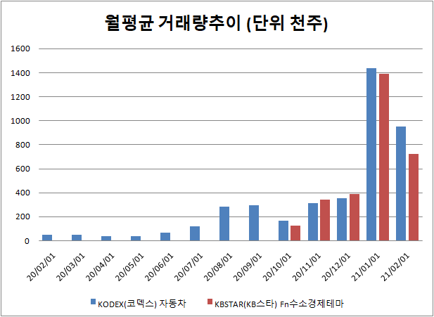 월평균 거래량 추이를 보면 2021년 01월 급상승 했으며, KODEX(코덱스) 자동차의 거래량이 더 높은 편입니다.