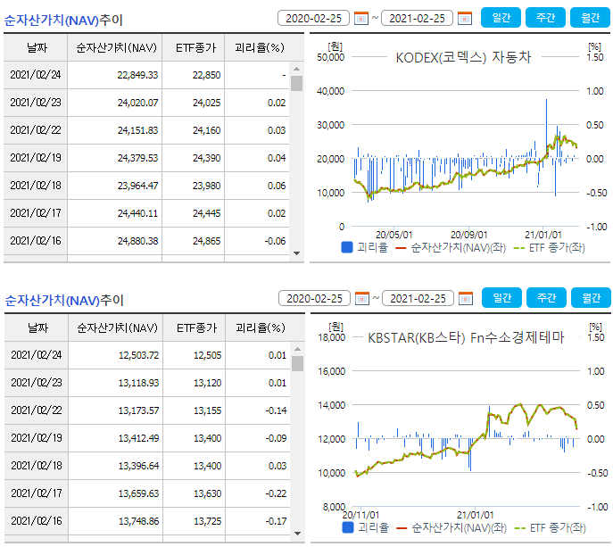 2021년 01월 거래가 몰리면서 두 상품모두 평소보다 괴리율이 증가 했습니다. 개인적으로 괴리율은 양호한 것 같습니다.