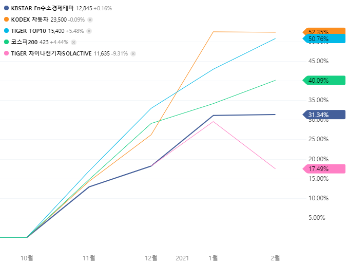 KBSTAR(KB스타) Fn수소경제테마의 상장일이 얼마안되 2020년 10월 부터의 주가를 비교한 표입니다.
