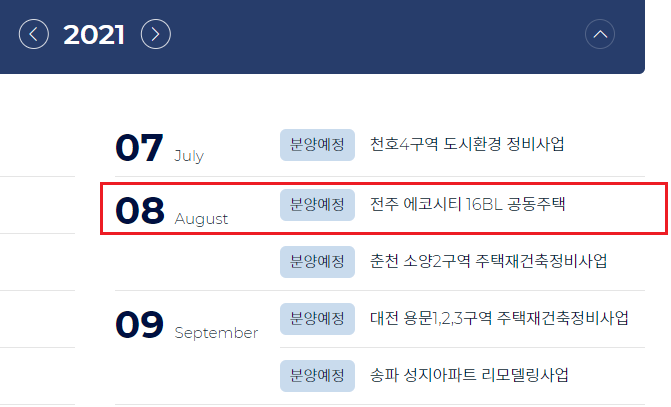 ■ 더샵 분양단지 캘린더를 보면 2021년 08월 전주에코시티 16BL 공동주택 예정이라고 나와있습니다.