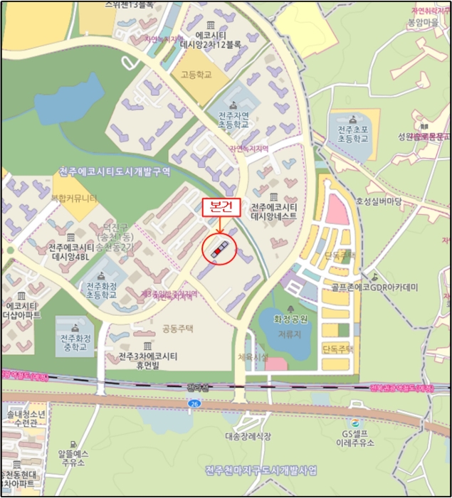본건은 전라북도 전주시 덕진구 송천동2가 소재 ‘전주화정중학교’ 북동측 인근에 위치하는 『에코시티데시앙7블럭아파트 제702동 제23층 제2302호, 인근은 아파트단지 및 근린생활시설 등으로 구성된 주거지대로서 주위환경은 보통시됩니다.