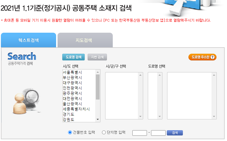 ■ 도로명, 지번검색 또는 지도검색을 통해 원하시는 물건의 공시가격 열람을 하실 수 있습니다.